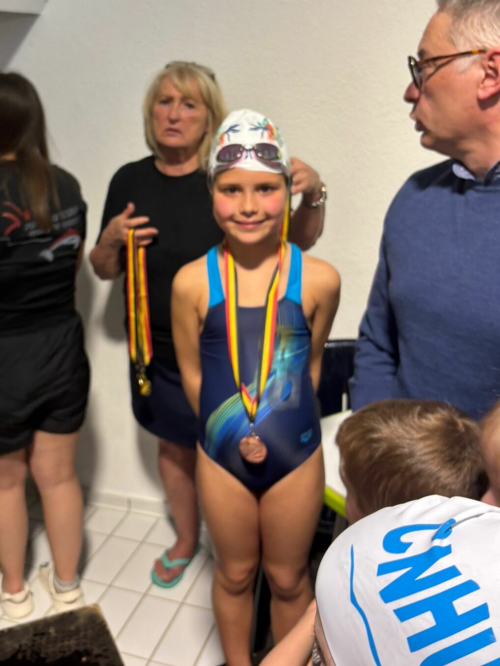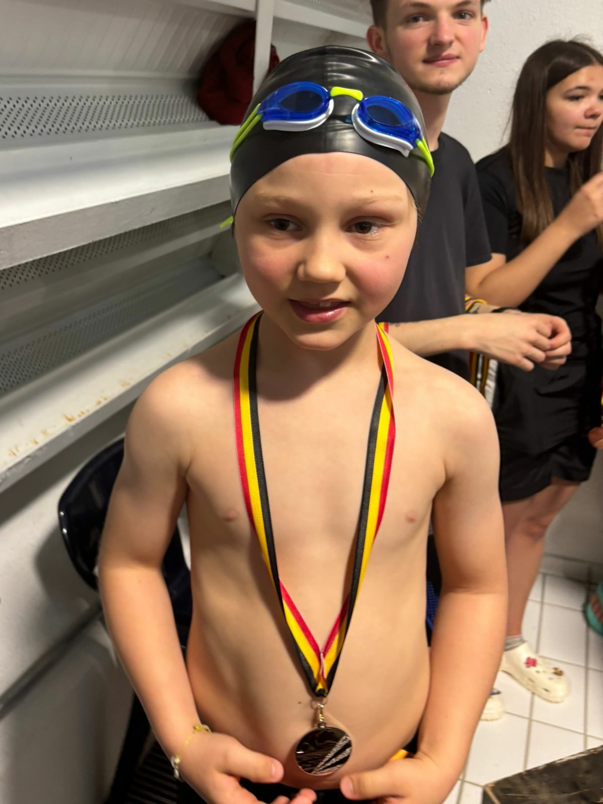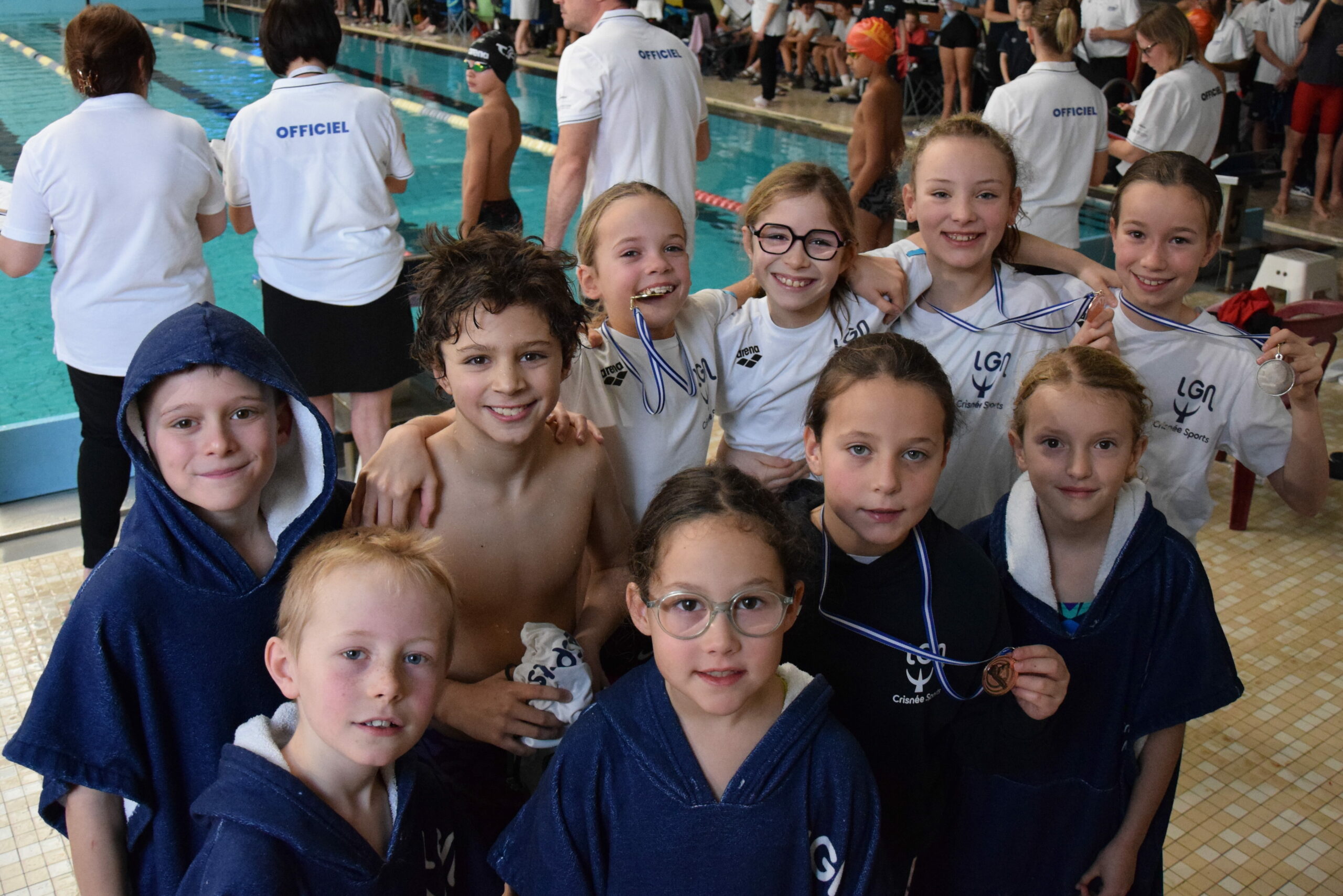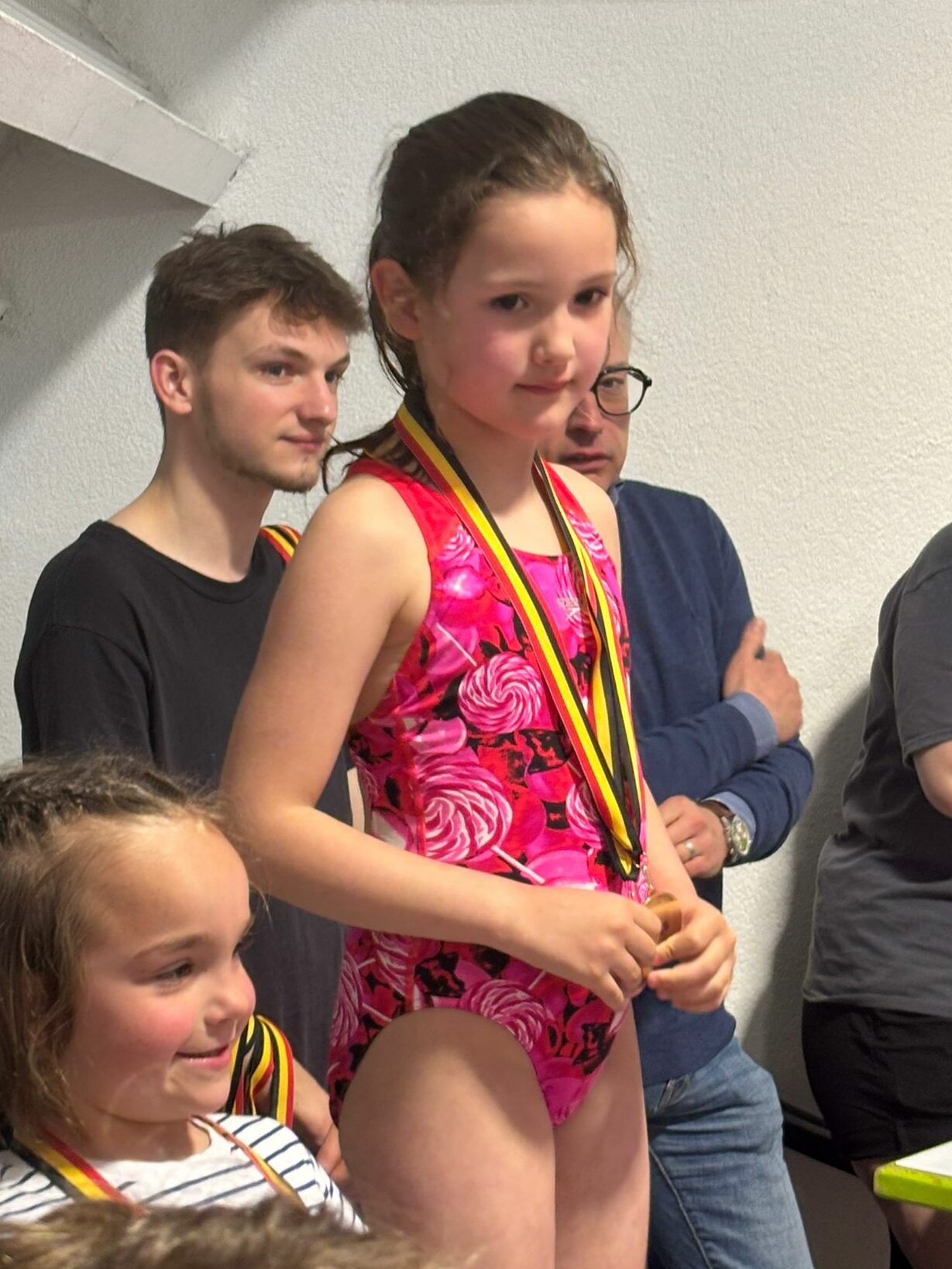 Chez les Canetons, le système de classement était plus classique : 1 course, 3 médailles. Et, à ce petit jeu, nos jeunes pousses s’en sont donné à cœur joie dans les différentes catégories d’âge. « Ils ont très bien nagé », analysait Sylvie, un grand sourire aux lèvres. « Comme ils nagent en mixte dans les courses, on a eu droit à un super duel en 100m crawl entre Laly Thyse et Baptiste Roomans. Ils s’entendent bien et chacun a tout donné pour battre le copain. Et rien de tel qu’une saine rivalité pour nager plus vite. Au terme d’une course de dingues, c’est Laly qui a remporté le duel d’un cheveu (1:20.02 contre 1:20.04 pour Baptiste). Si elle n’avait nagé qu’avec des filles, elle n’aurait pas fait aussi bien vu que la concurrence était reléguée à 6 secondes. Je retiens aussi le 100m brasse de Niene Jorissen, qui réussit 1:41.28. Sur 100m crawl, Julia Prégardien signe un bon 1:34. Quant à Axel Bodson-Felingue, pour sa première compétition, il a parfaitement négocié ses 3 virages sur 100m dos. Et, en crawl, il améliore de 14 secondes son chrono datant du mois de janvier, lors de la 2e manche du Challenge des non licenciés, à Wanze. Ils étaient donc tous très contents d’avoir décroché des médailles. »